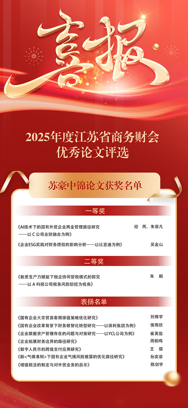 近日,在江蘇省經(jīng)濟(jì)貿(mào)易會計(jì)學(xué)會主辦的2025年度全省商務(wù)財(cái)會優(yōu)秀論文遴選活動中,蘇豪中錦公司精心組織,共提交10篇參賽論文,成功斬獲一等獎2篇、二等獎1篇,另有7篇入選表揚(yáng)名單。